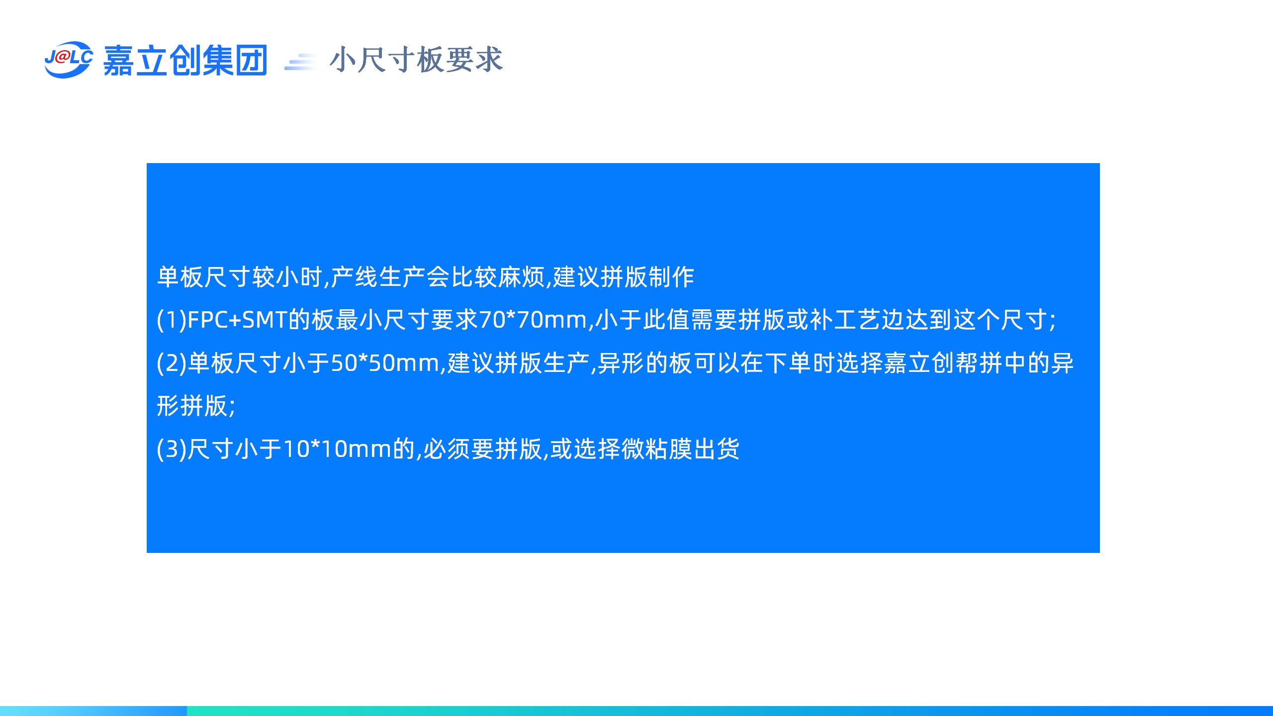 单板尺寸较小时,产线生产会比较麻烦,建议拼版制作。(1)FPC+SMT的板最小尺寸要求70*70mm,小于此值需要拼版或补工艺边达到这个尺寸;(2)单板尺寸小于50*50,建议拼版生产,异形的板可以在下单时选择嘉立创帮拼(非常规拼版);(3)尺寸小于10*10mm的,必须要拼版,或选择微粘膜出货。