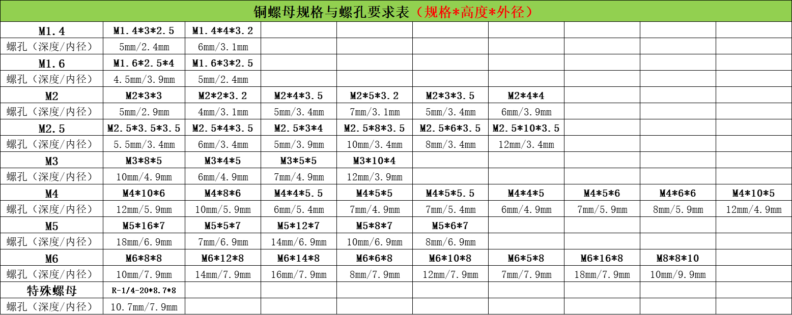 5、螺孔设计需满足“铜螺母规格与螺孔要求表”中所对应螺母的螺孔要求。