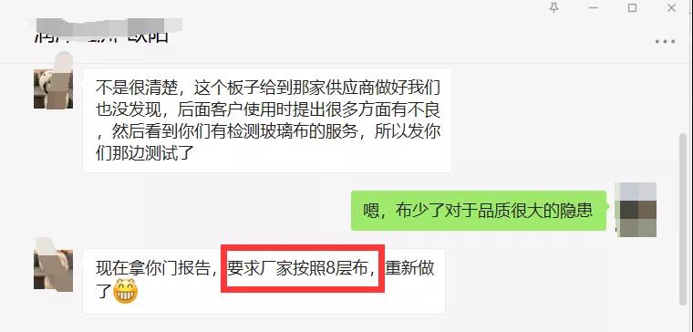 板子有问题,一检测6张布,最终按8张布标准重新生产,6张布的危害大,客户对于我们表示了感谢!