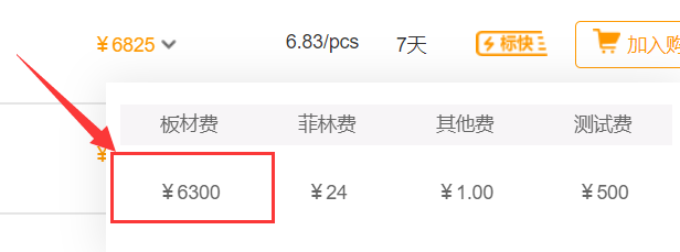 01 嘉立创采用:8张布、阻燃的A级别板材,按板材费298元/平方米计算,10平米板材总价为2980元。截图如下: