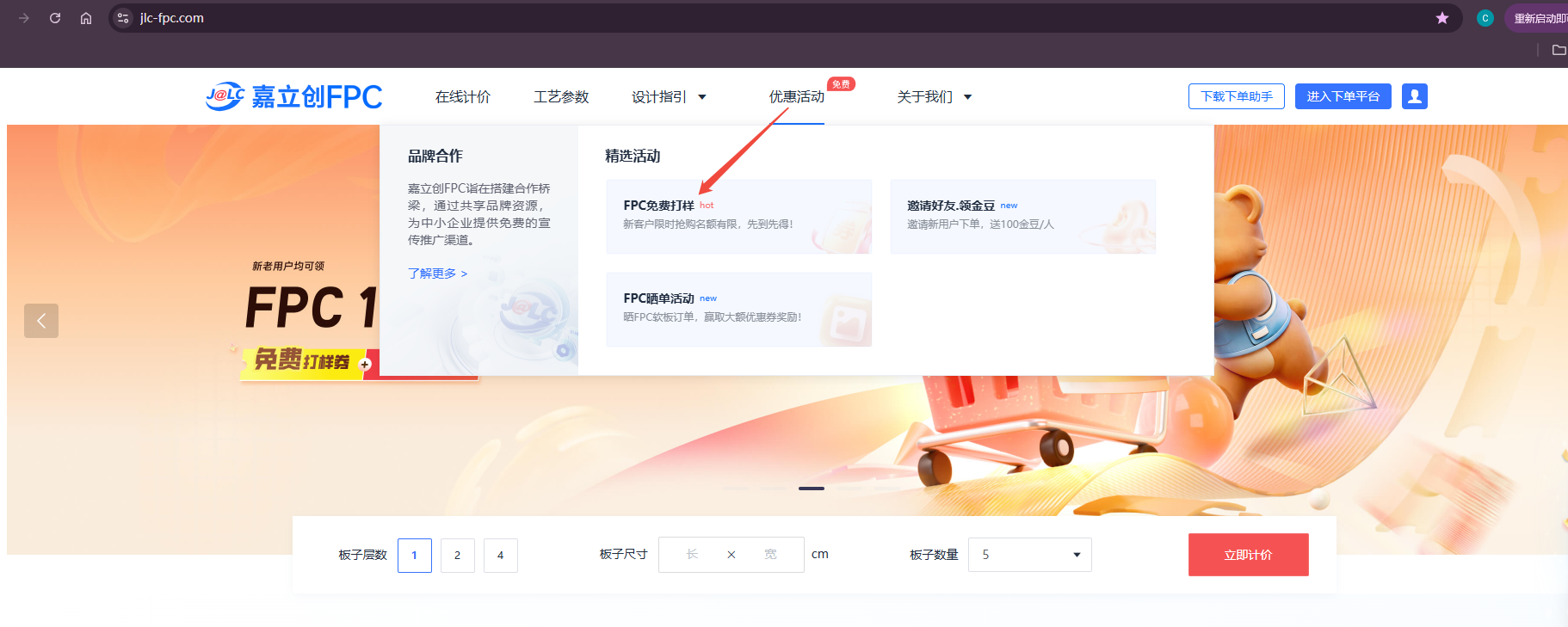 也可在嘉立创FPC官网首页点击领取,如图所示: