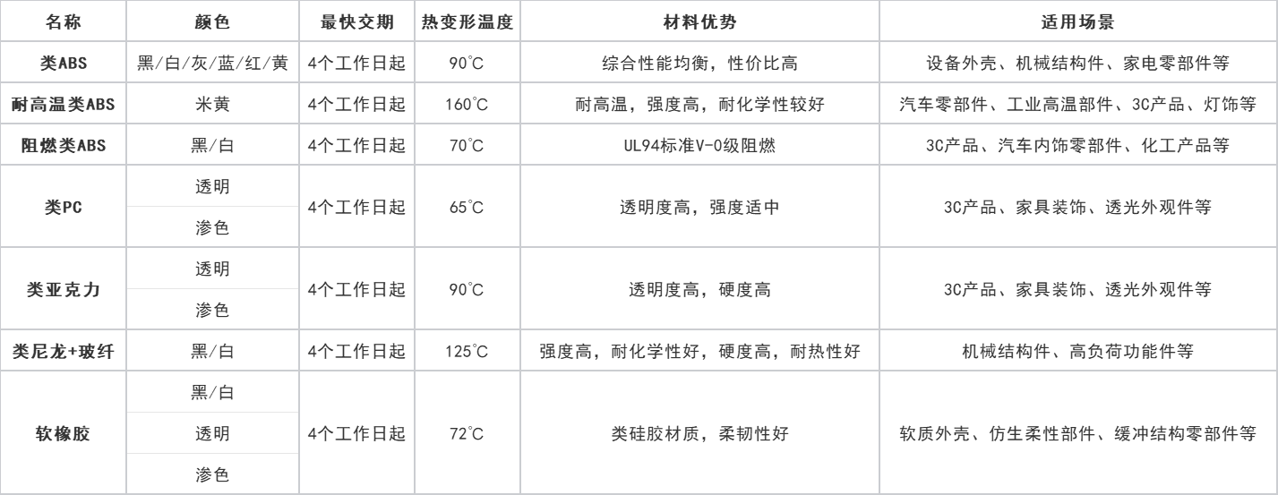 优点:周期短(3-7 天可完成小批量生产),成本低(无需开昂贵钢模),材料选择广(支持多种树脂、软胶等)