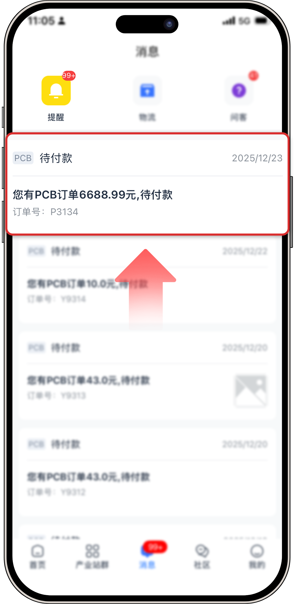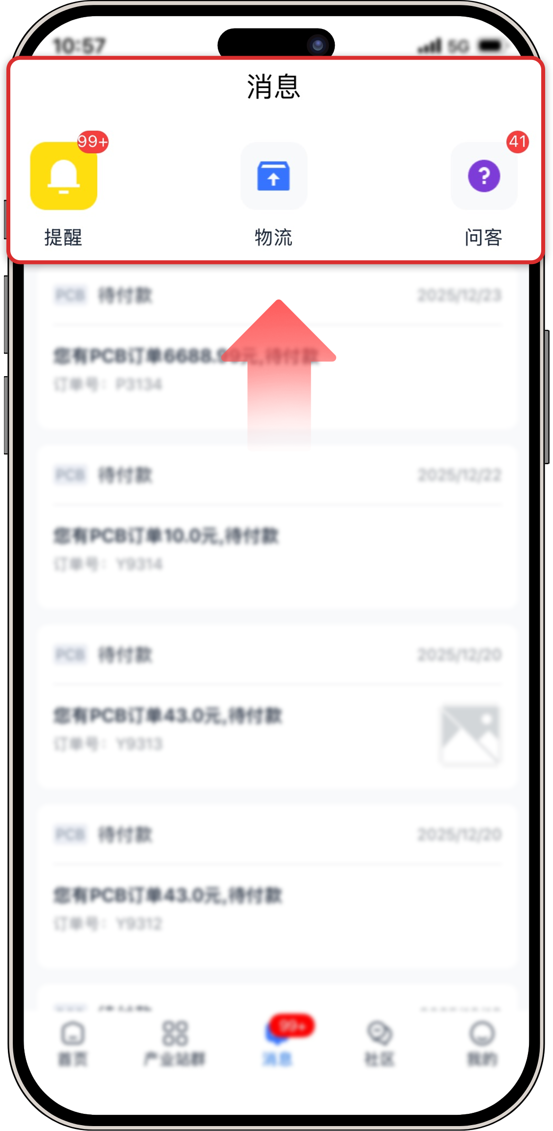 对于老客户(已有PCB订单):底部中央图标将自动显示为【消息】,并结合App数字图标(红点)实时提示待办事项,让你一眼锁定重要动态。
