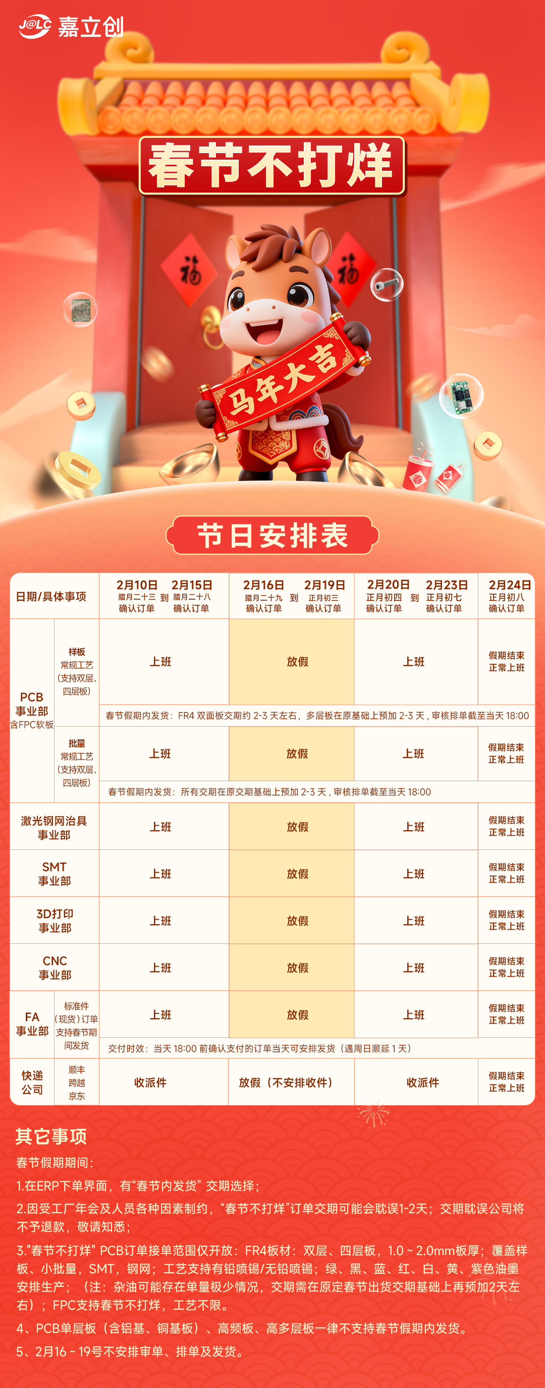 为了在2026丙午马年继续做广大客户最坚实的后盾,嘉立创将继续开展“春节不打烊”活动,用坚守传递年味,以速度致敬创新!