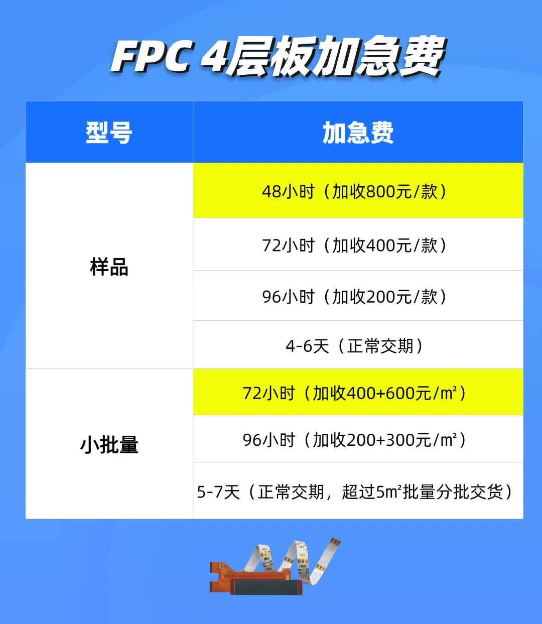 对于研发打样和量产补单等紧急需求,嘉立创FPC四层板提供多种灵活交期方案,最快48小时交付。若客户有需求,我们也可加速到24小时交付!