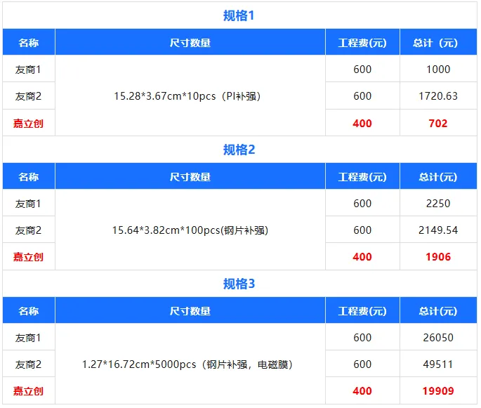 通过与2家友商的价格对比发现:嘉立创FPC四层板在工程费和总价上均占优势,相同规格下定制成本直降30%-50%。相同资料报价情况如下:
