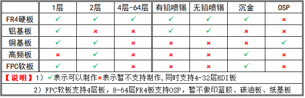 ■ 暂不制作印蓝胶、碳油、纸基板等系统无选项的特殊工艺(8-64层支持OSP工艺)