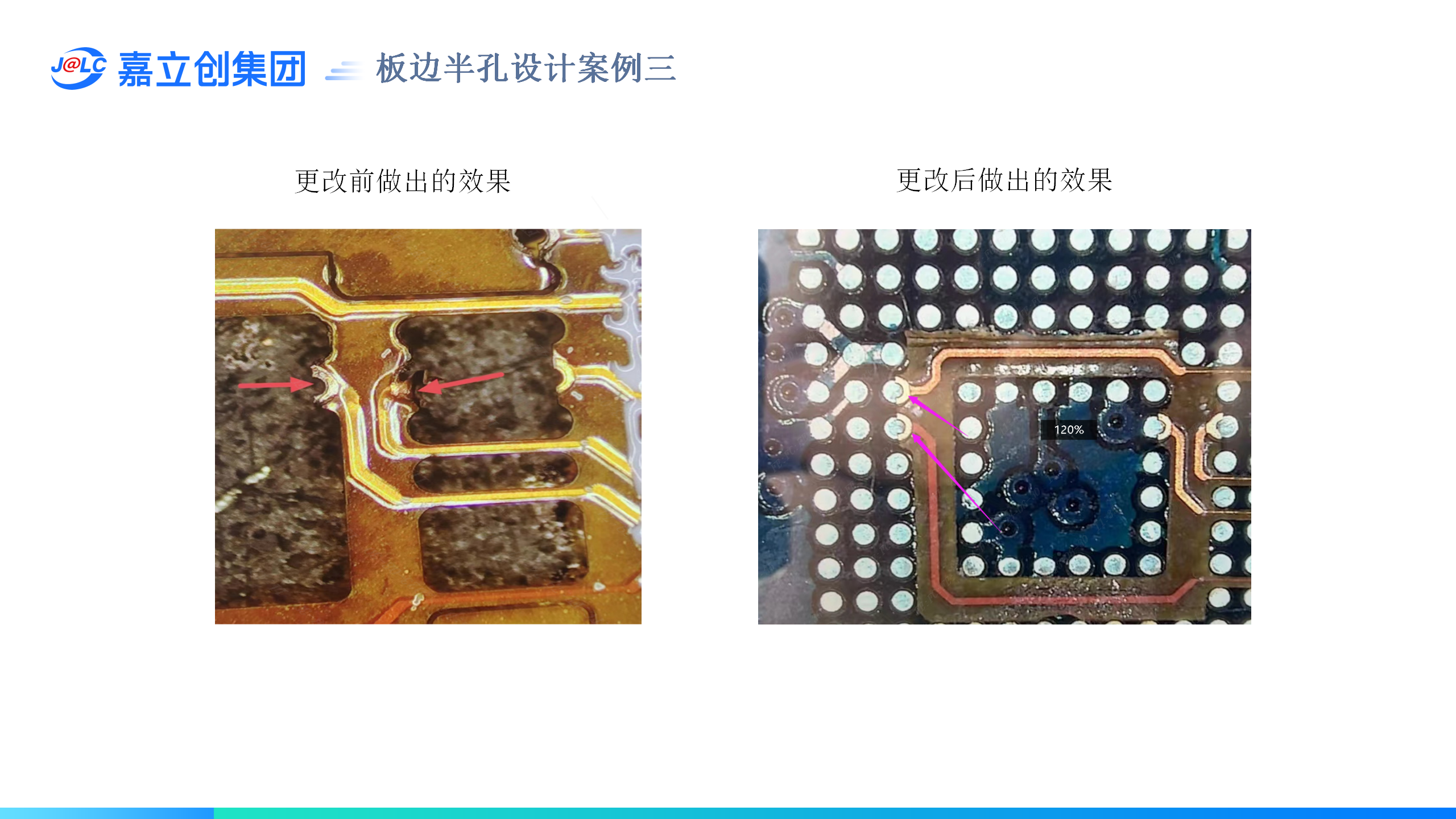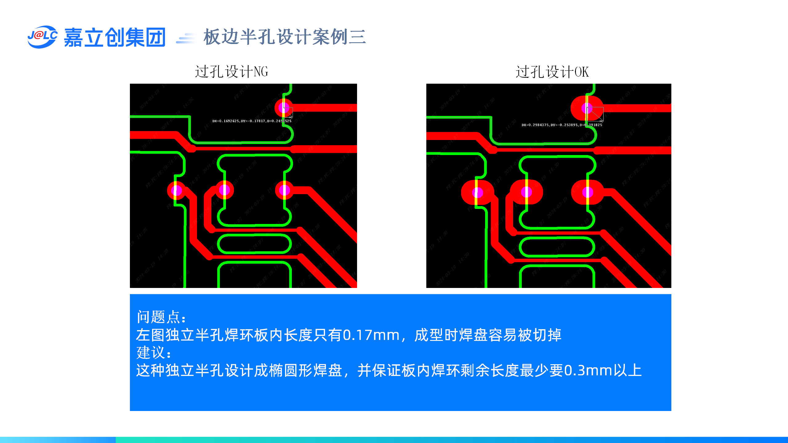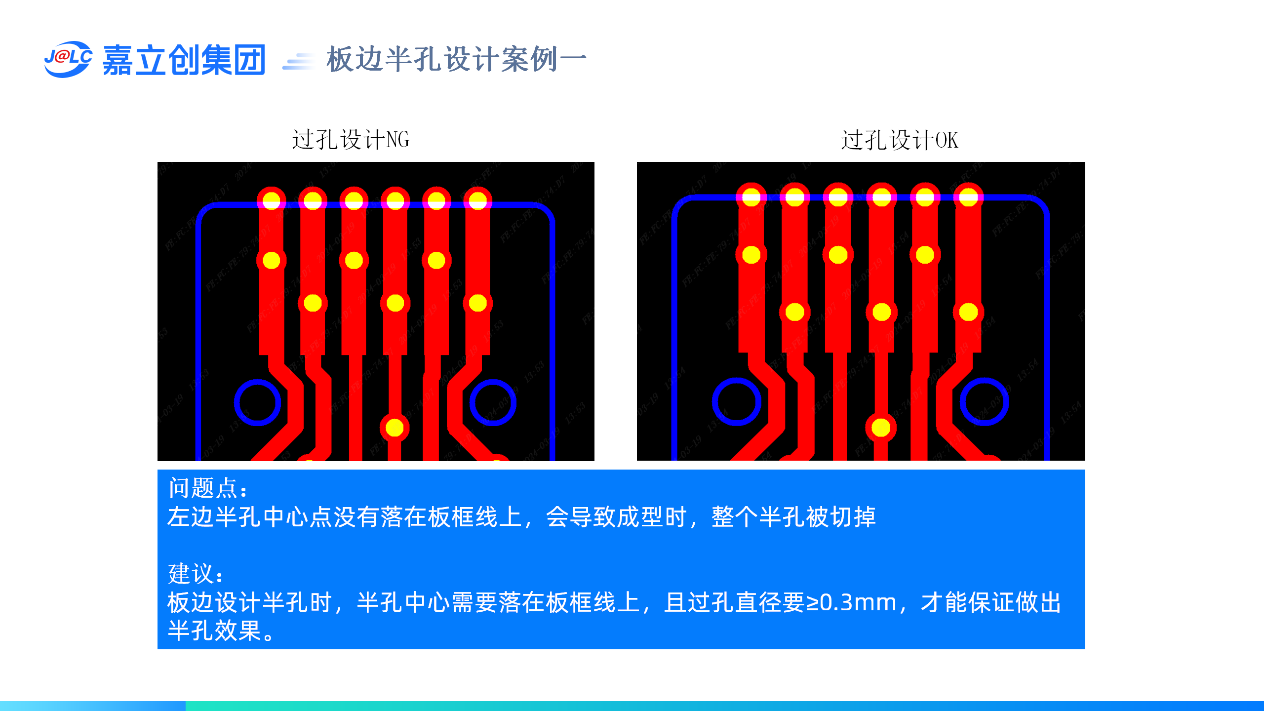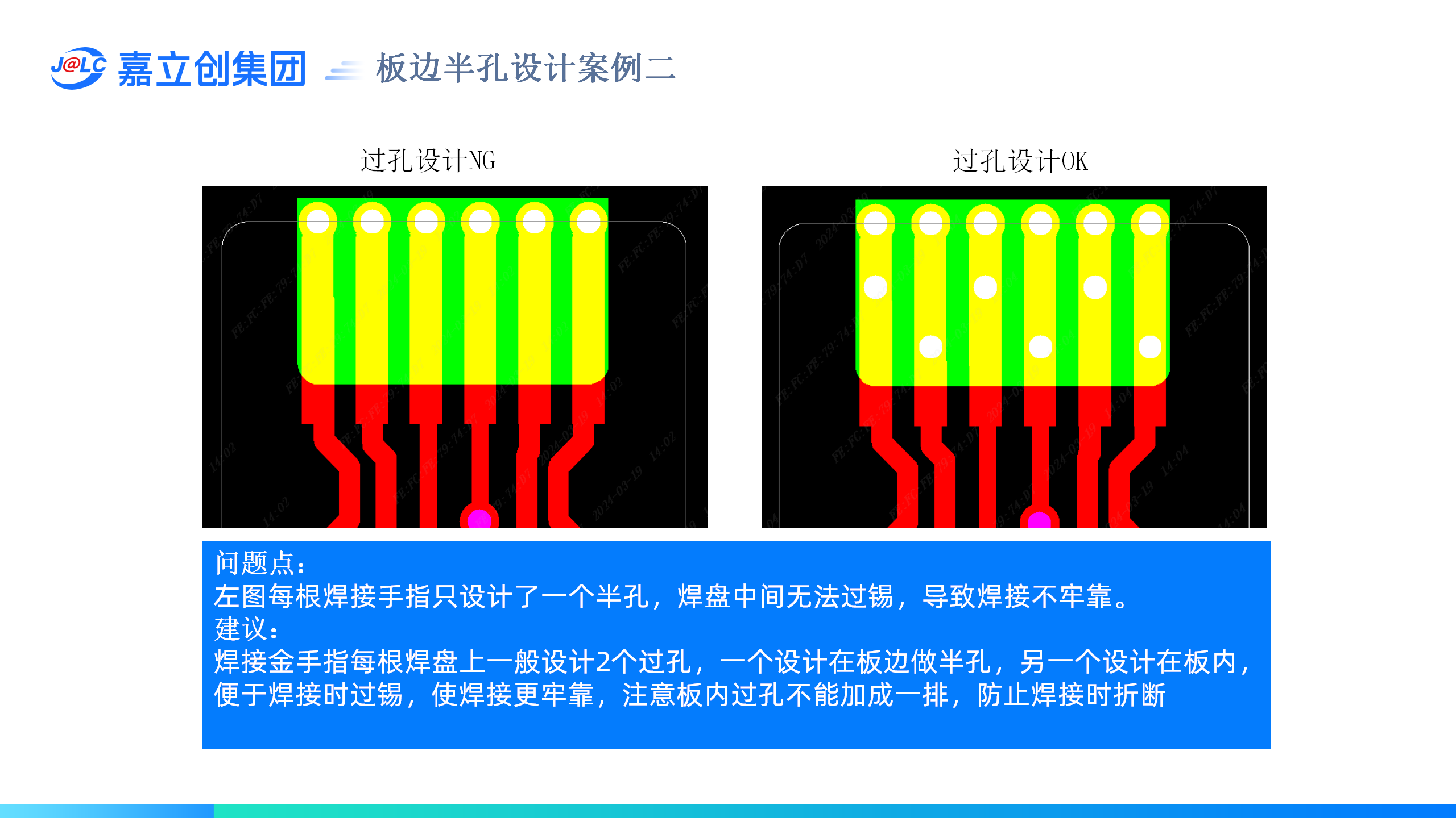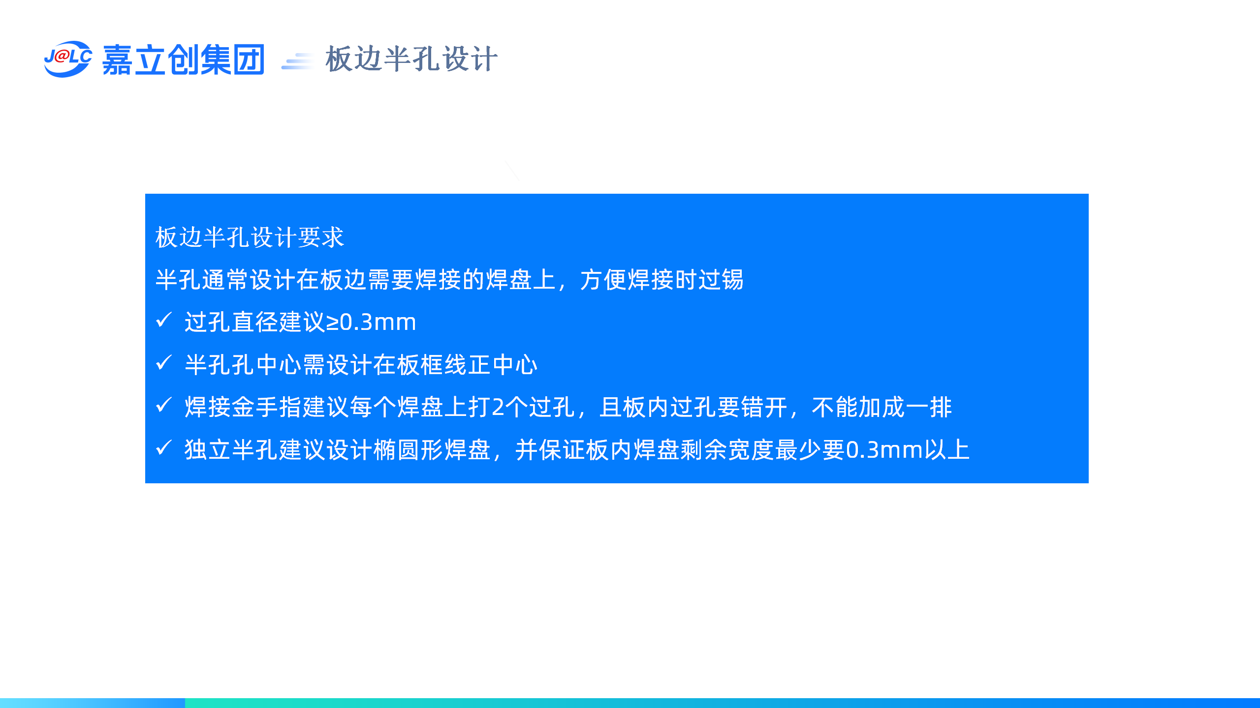 半孔通常设计在板边需要焊接的焊盘上,方便焊接时过锡 。(1)过孔直径建议≥0.3mm ;(2)半孔孔中心需设计在板框线正中心 ;(3)焊接金手指建议每个焊盘上打2个过孔,且板内过孔要错开,不能加成一排;(4)独立半孔建议设计椭圆形焊盘,并保证板内焊盘剩余宽度最少要0.3mm以上。
