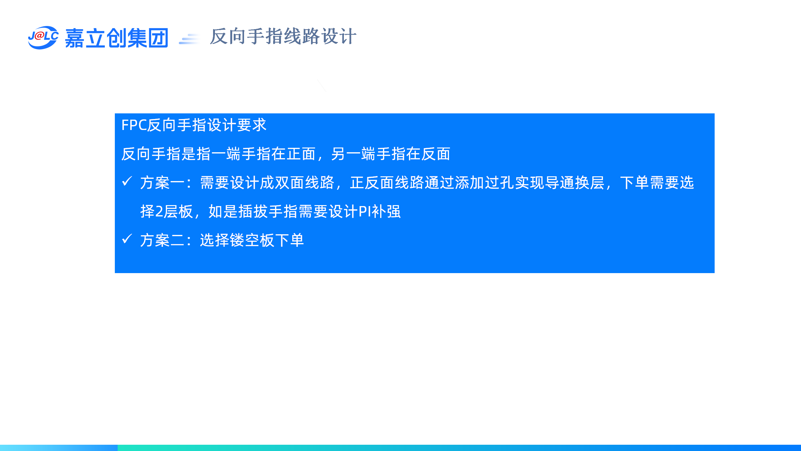 反向手指是指一端手指在正面,另一端手指在反面。(1)需要设计成双面线路,正反面线路通过添加过孔实现导通换层;(2)下单需要选择2层板,如是插拔手指需要设计PI补强