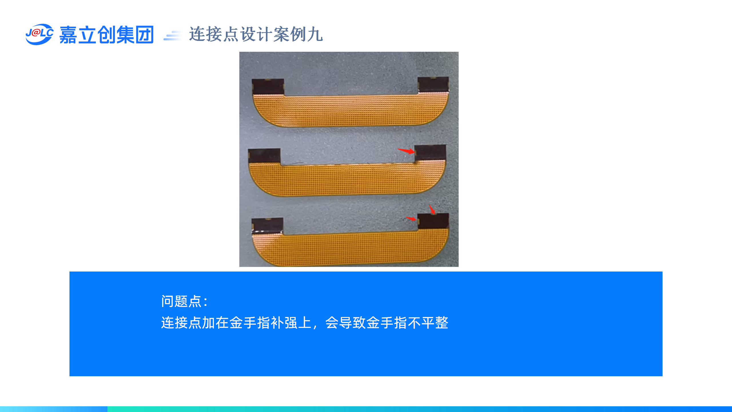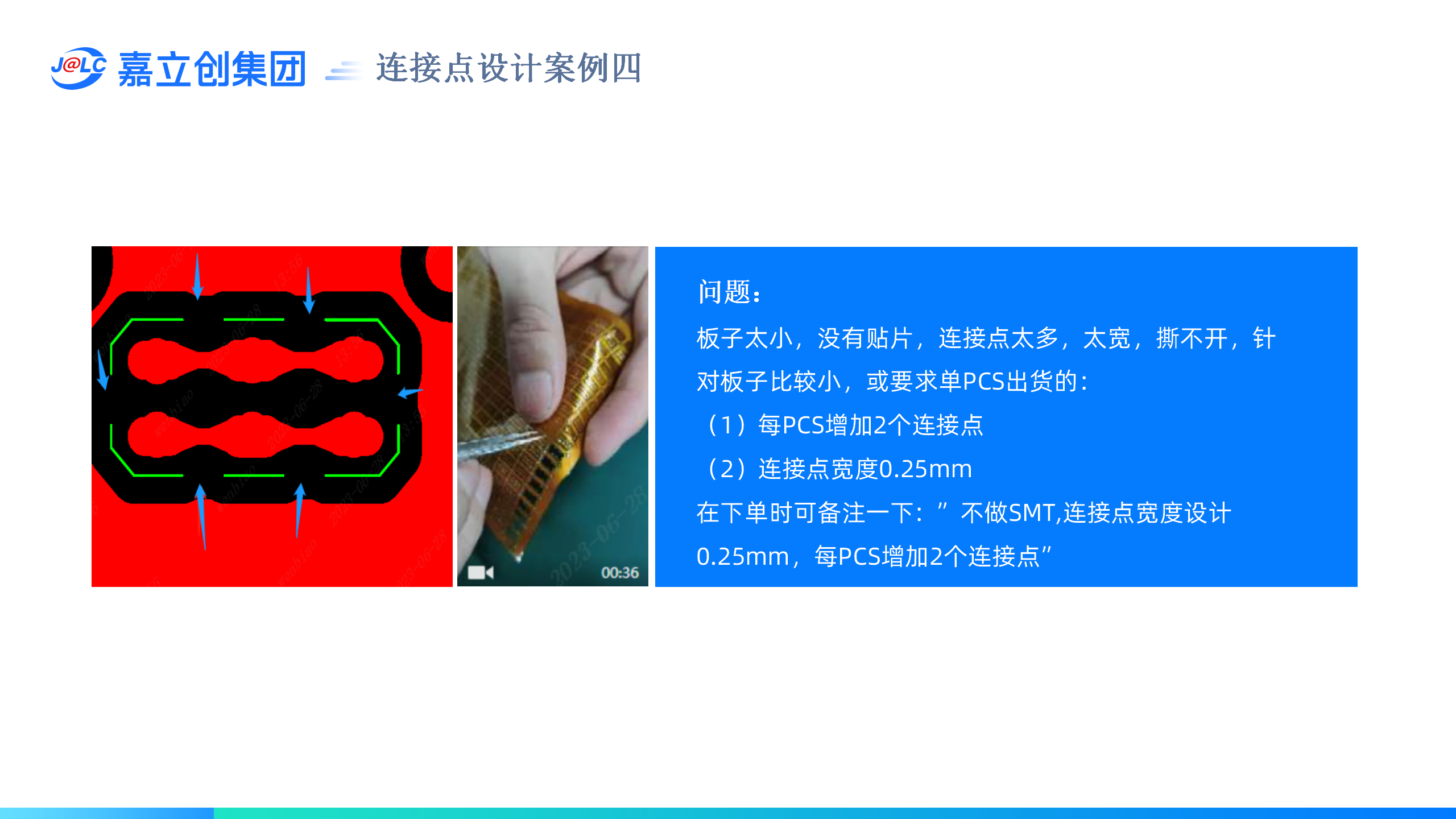 FPC连接点宽度要根据板尺寸,是否做SMT,是否有钢片或厚FR4来决定 (1)SMT的板连接点宽度一般设计0.8mm; (2)非SMT的板连接点宽度一般设计0.25-0.3mm,每PCS增加2-3个连接点,(下单时最好备注一下); (3)连接点没特别要求时可让嘉立创来添加。