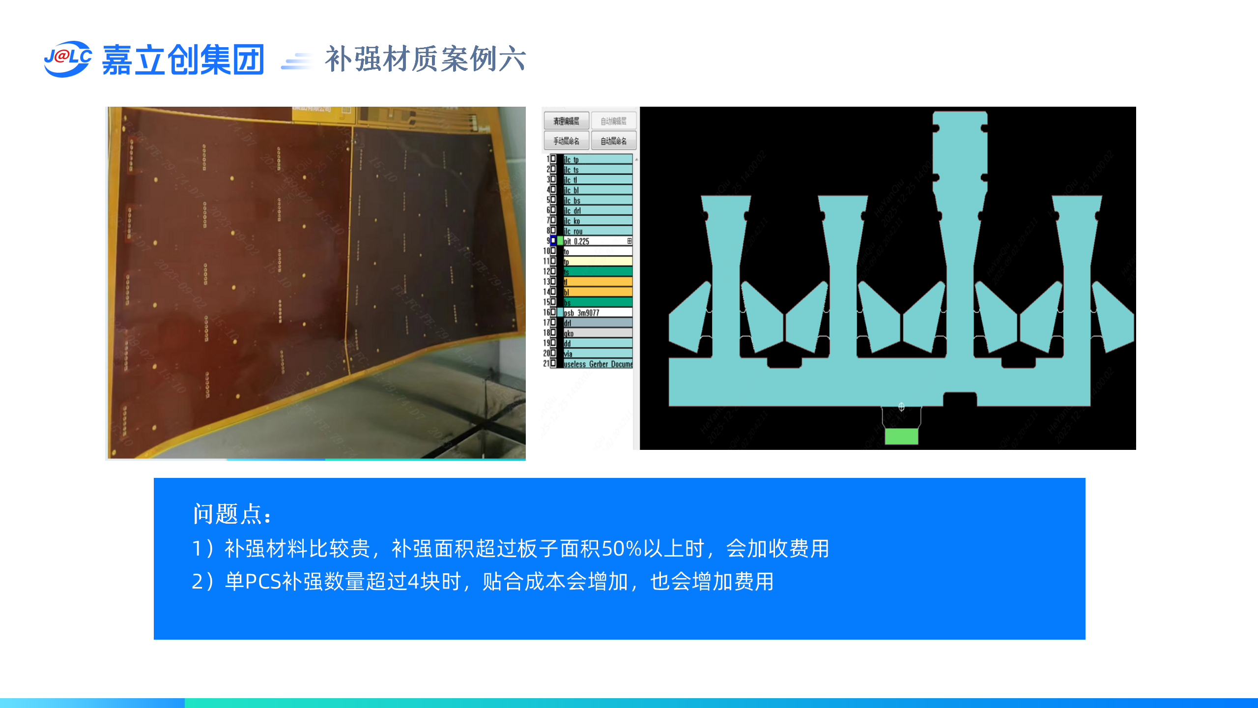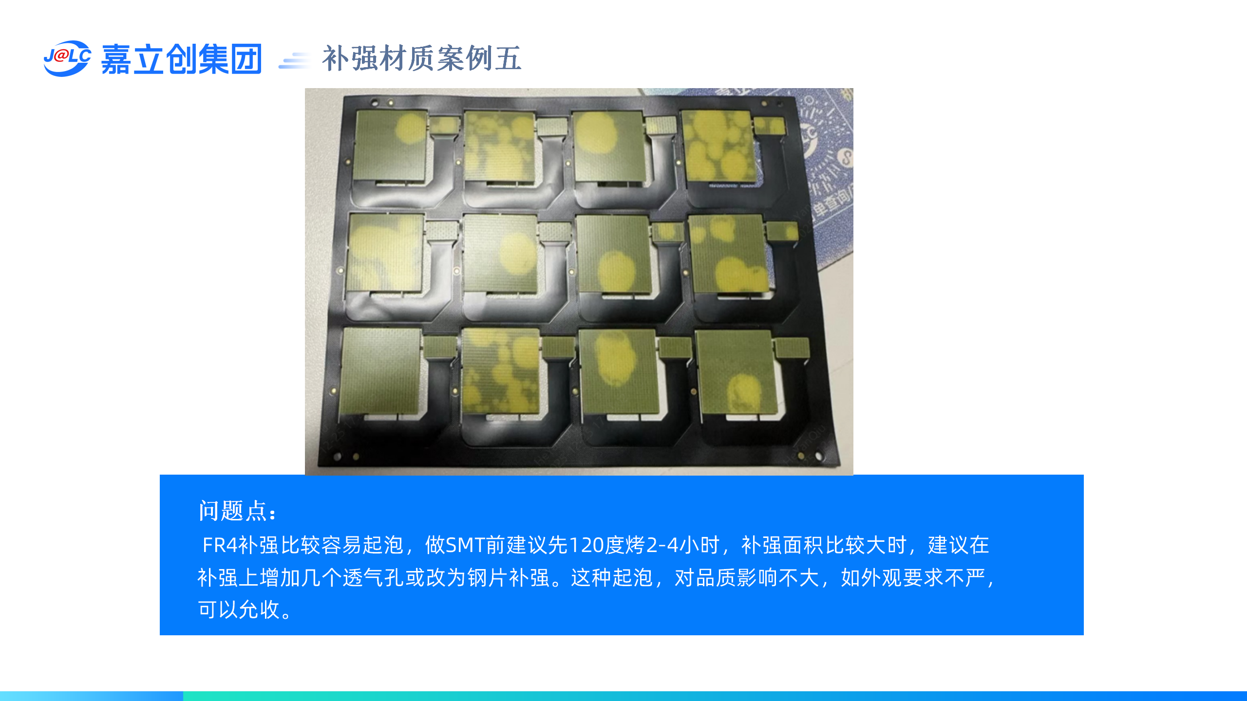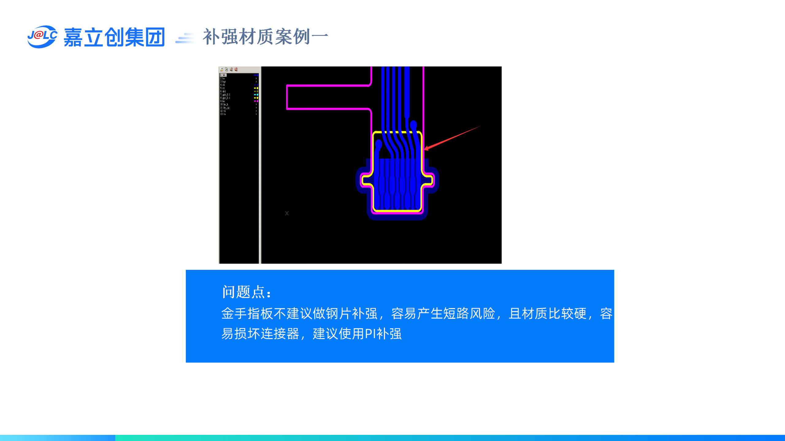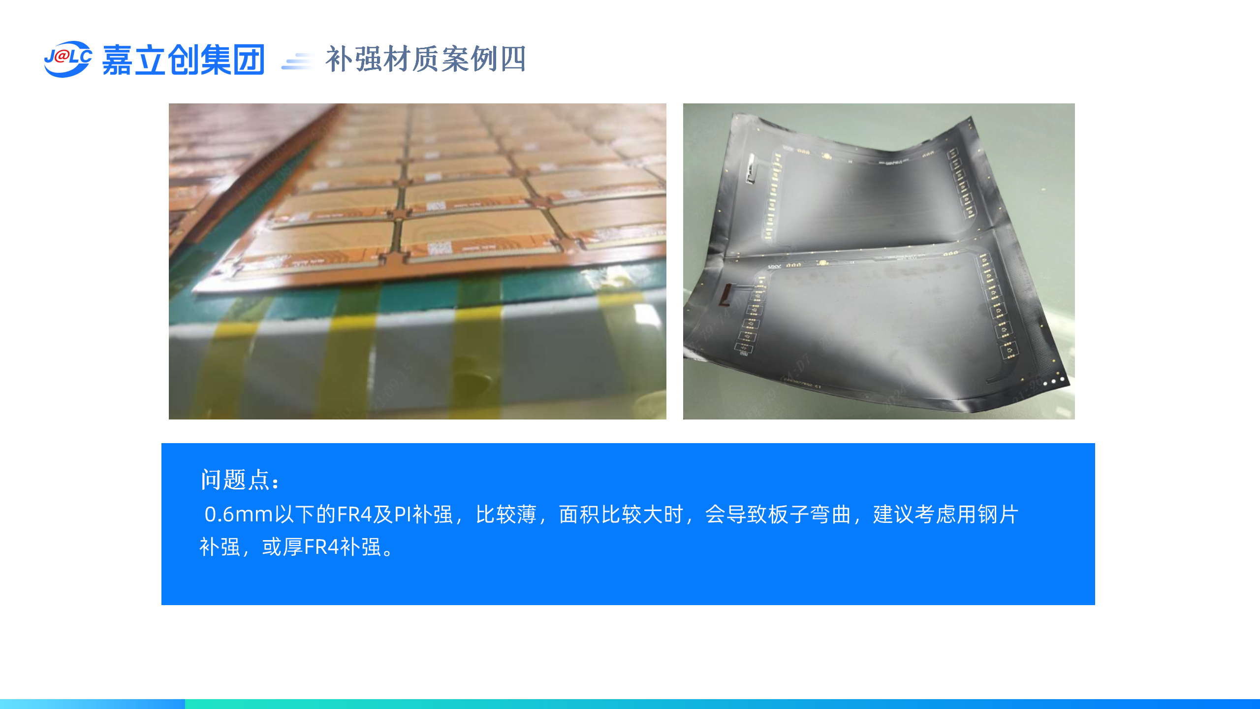(1)PI补强适用于插拔类金手指区域补强; (2)FR4适用插件孔区域补强或低端的IC芯片背面; (3)钢片适用于IC芯片,BGA等器件背面补强,平整度较好,但霍尔元件及插件孔不能使用。