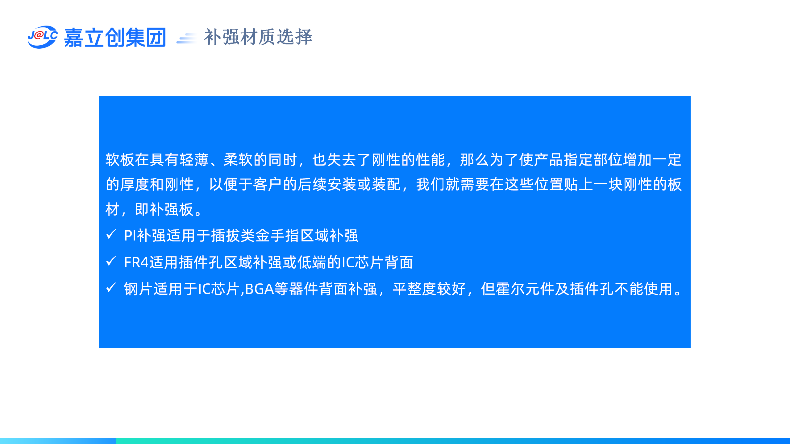 软板在具有轻薄、柔软的同时,也失去了刚性的性能,为了使产品指定部位增加一定的厚度和刚性,以便于客户的后续安装或装配,我们就需要在这些位置贴上一块刚性的板材,即补强板。