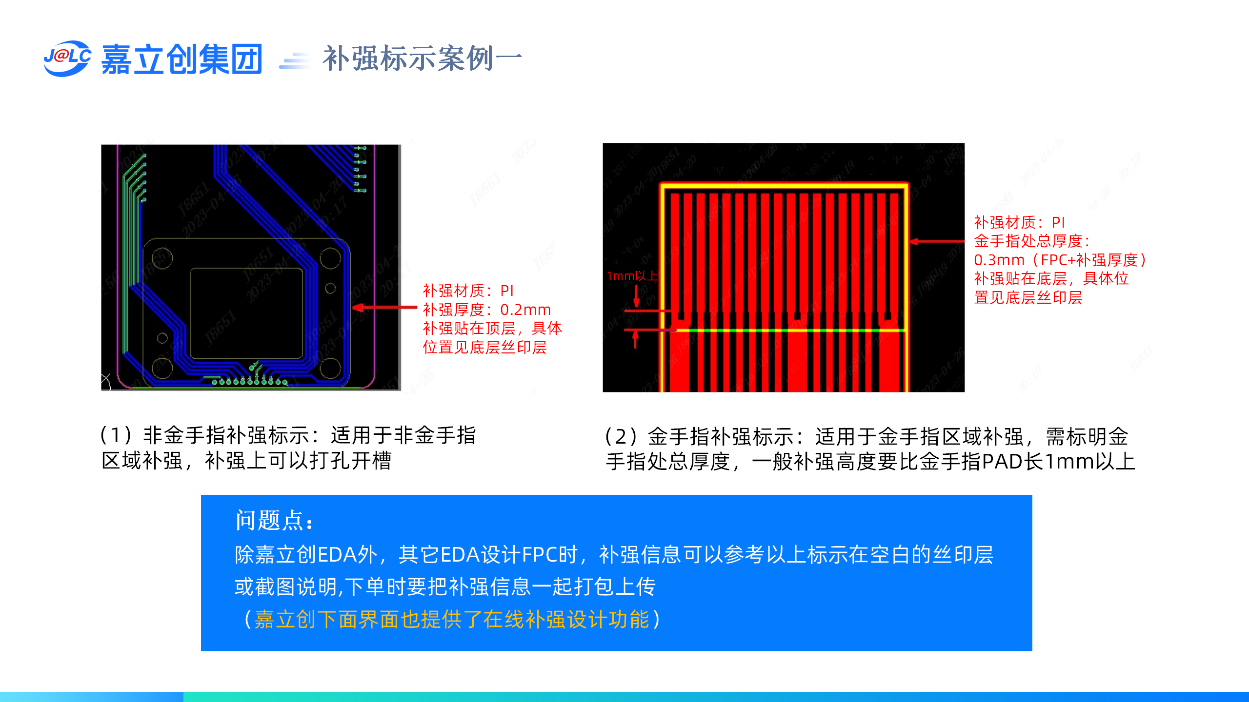 在设计时需要标示好补强信息,建议使用嘉立创EDA来设计FPC,有专门设计FPC补强板的功能,下单不用勾选补强信息而且还可以减50元/单。(1)材质、厚度、层别、区域,需明确标示出来 (2)下单时一定要提供补强信息。