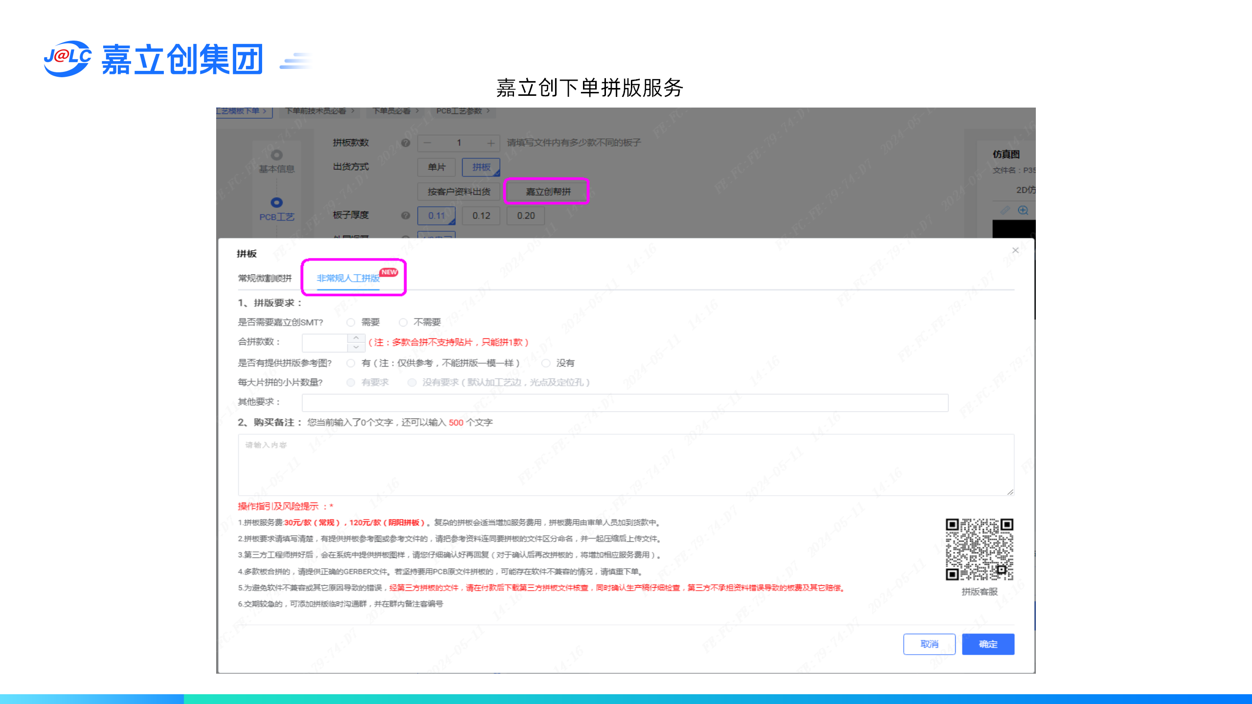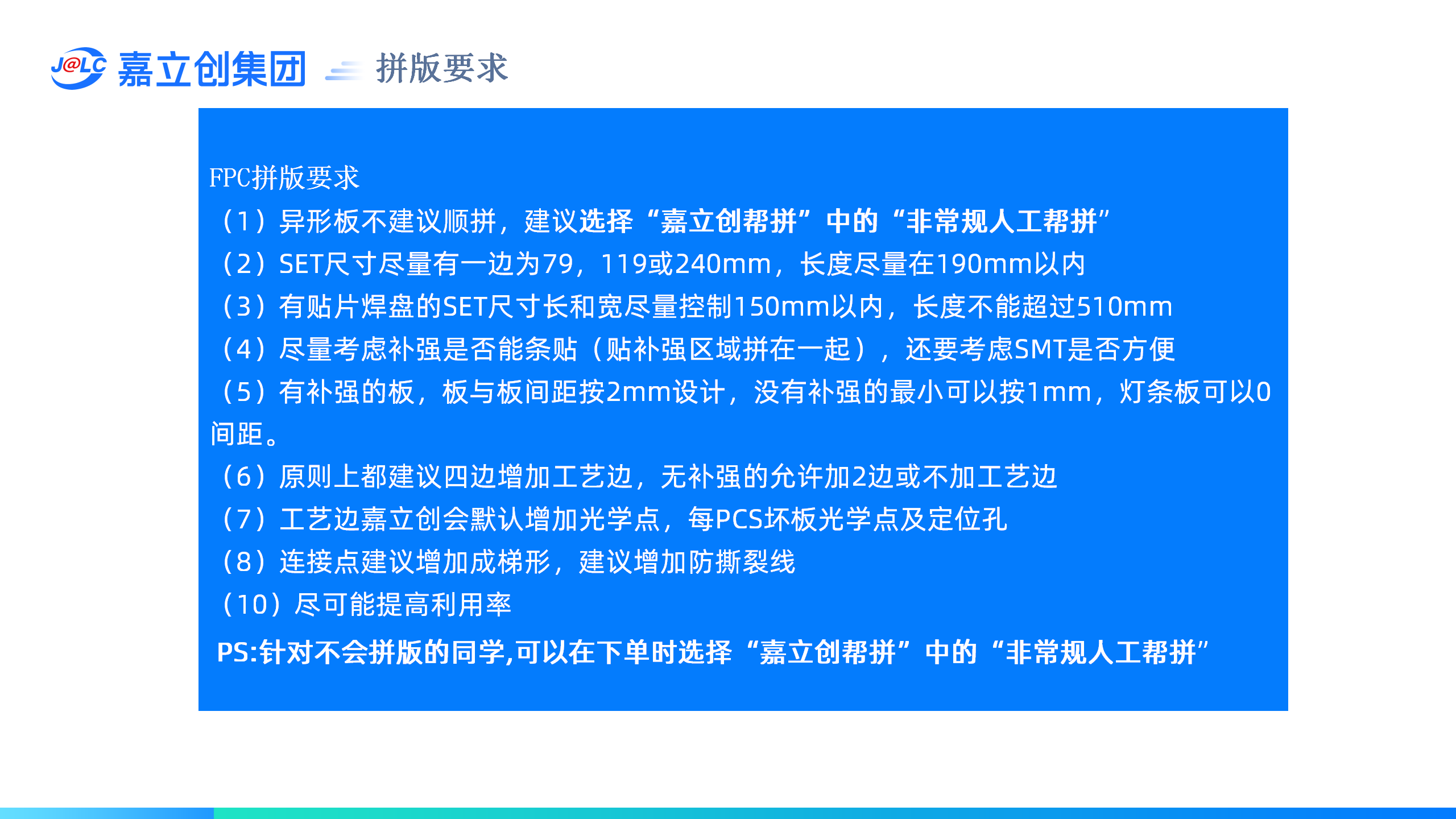 FPC拼版要求:针对不会拼版的同学,可以在下单时选择“嘉立创帮拼”中的“非常规人工帮拼”