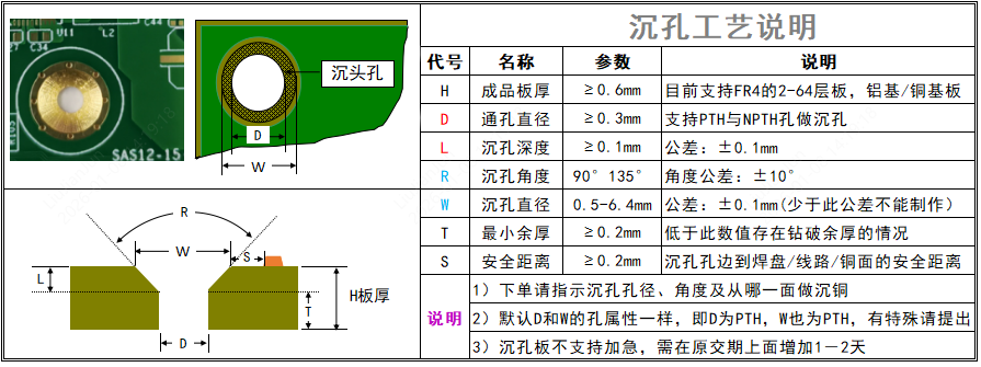 沉孔在生产加工中,是先钻一个通孔(PTH或NPTH),然后在其上方再用一个锥形钻头通过管控深度钻出来。其分为两类:
