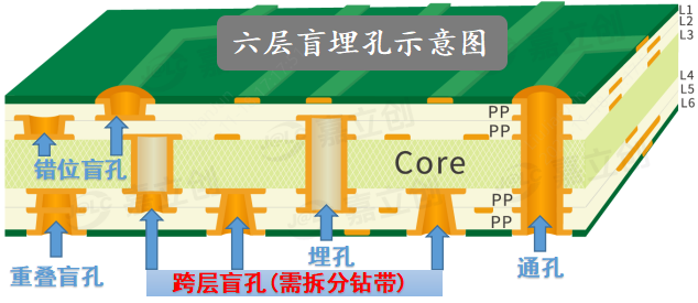 跨层盲孔(Skip via):跨越2层以上不同层次的盲孔,制作时拆分为重叠盲埋孔生产