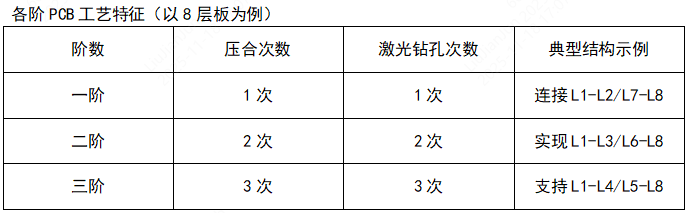 1)压合两次镭射,三阶三次压合三次镭射,依此类推。PCB 阶数由两个关键指标决定: