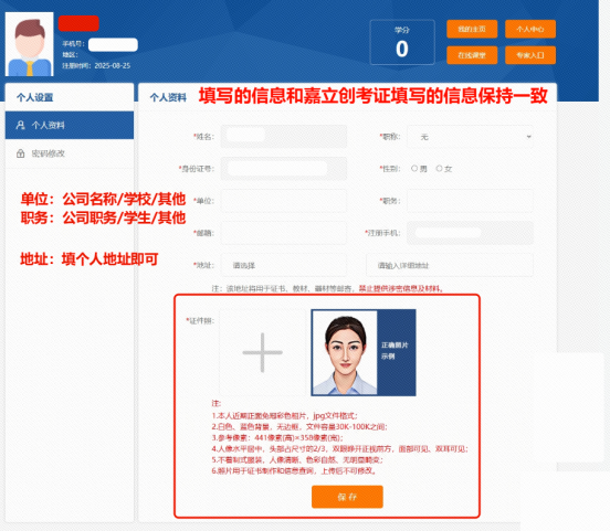 • 学员在培训网站注册的个人信息、证件照等信息是证书制作、材料邮寄等唯一信息,请务必确保信息完整、正确,并且保证与在嘉立创考证页面填写的信息一致。