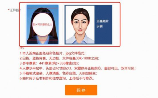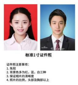 • 本人对照片质量负责,请使用标准的一寸证件照,如下图。一定要清晰,头肩比正常,务必保证照片的质量。严禁翻拍纸质证件照片,严禁使用灰色背景照片,证书照片背景必须是纯白,红和蓝色。如因照片产生的一切影响,后果由本人负责。