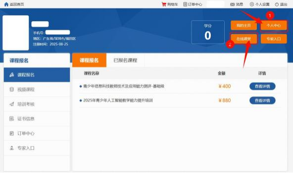 1. 在个人中心点击“我要选课 ” ,进入“在线课堂 ” 页面