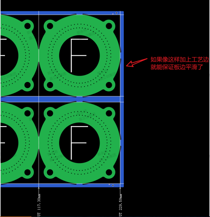 这种问题大多是异形的板子(外型非标准的长方形),良好的拼板,应该是这样的,四周都是工艺边,避免不平滑的边缘,注意它还配了如下的辅助项