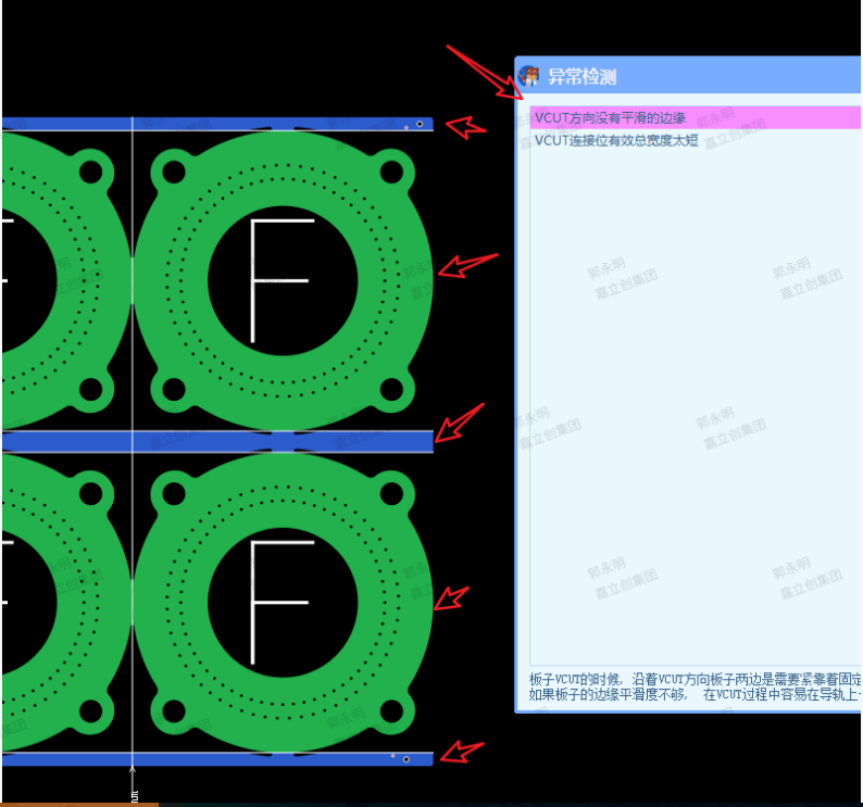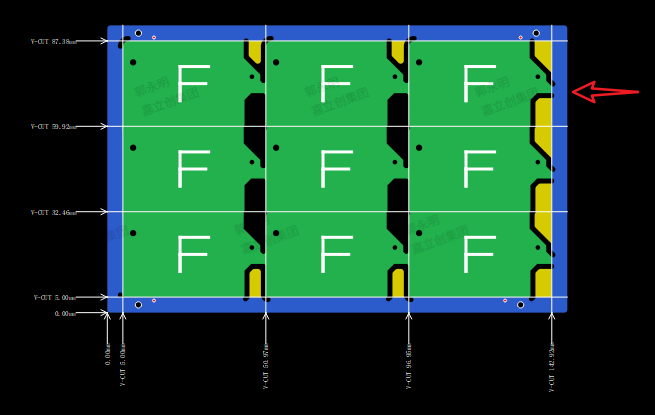 如下图所示,中间有一条垂直的VCUT线,那么板子右侧的的边缘是不平油的,有很多悬空,很容易被导轨撞断板子。