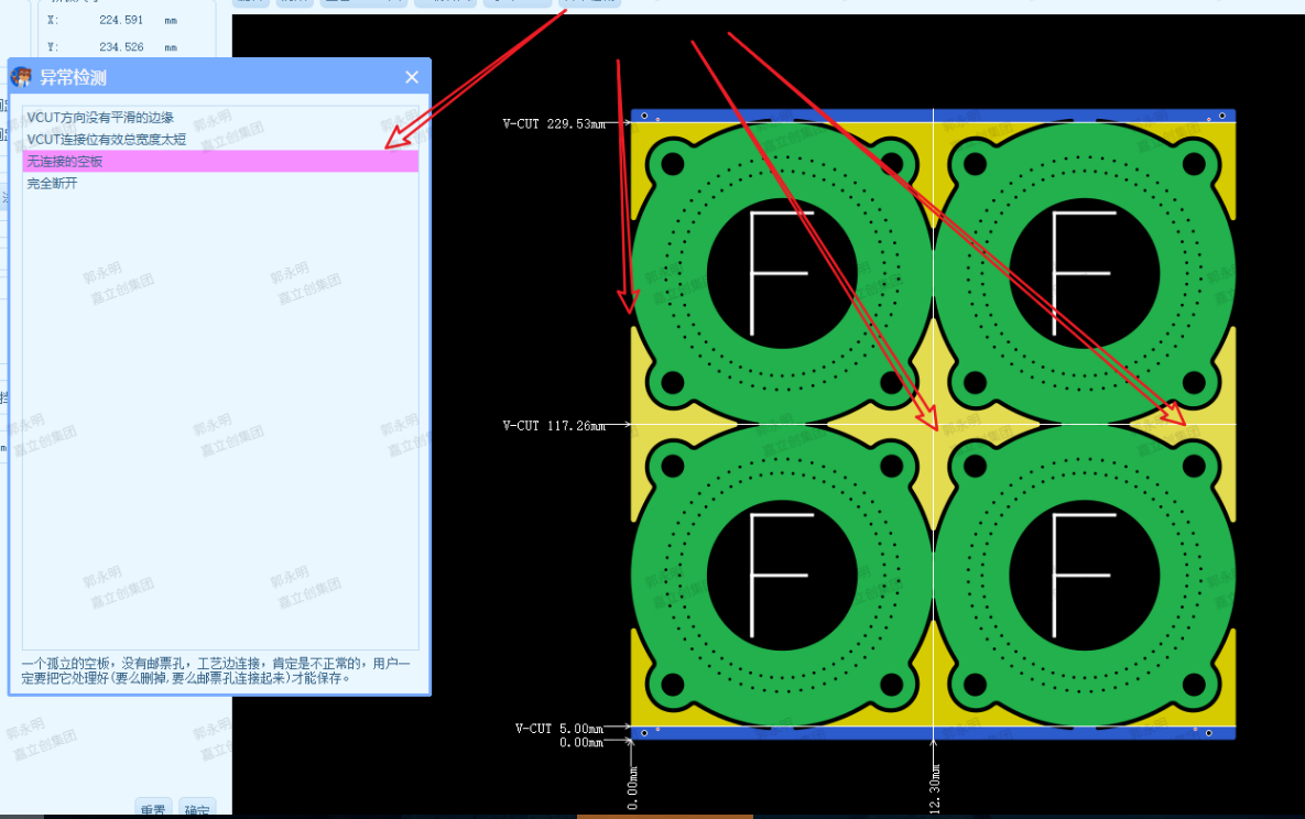 无连接的空板,是不允许拼板成功的,这种必须要你手动把它处理好,要么你删掉它,要么你用邮票孔把它加固。