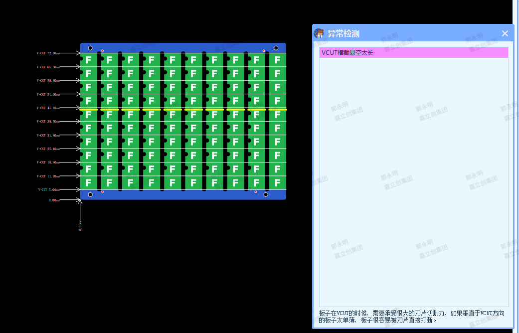如下图所示,这种板子在VCUT的时候, 需要承受很大的刀片切割力, 如果垂直于VCUT方向的板子太单薄, 板子很容易被刀片直接打断。