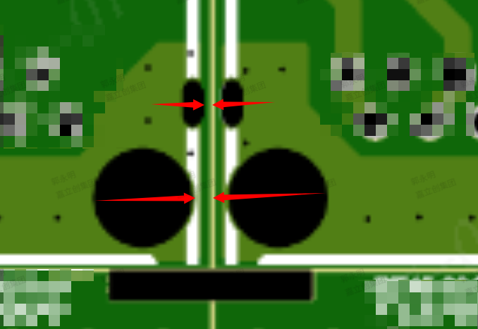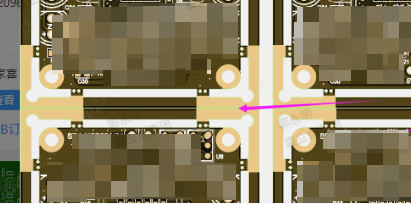 如下图所示,这种板子箭头所指的位置是VCUT线,它距板内大机械孔,或者锣槽比较近,导致这个空隙的板子边缘机械强度很软,嘉立创是可以生产,且不会发现品质问题,不过板子到了客户手中,等元件装配完成之后,把板子掰开,会连带把这边缘细小的部分撕扯拉断。