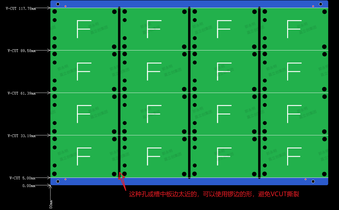 如下图所示,如果内槽或者大孔距板边太近, 一般都是这侧采用锣边的形式,避免VCUT。